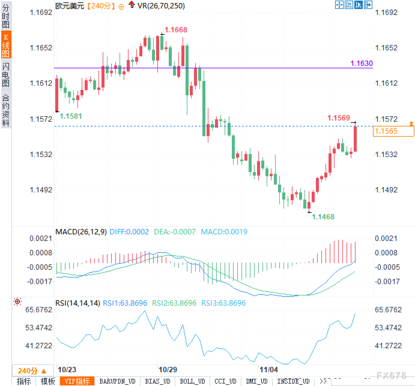 4小时图显示,欧元兑美元自1.1668一路回落至1.1468后展开修复,现报1.1565。价格已回到短期均衡区1.1530–1.1580附近,前高1.1569形成即时压力,1.1630为上一轮下破位的更高层阻力。MACD快慢线向上收敛并伴随柱体转正,动能由空转多;RSI升至约64,动量偏强但临近高位区,节奏易放缓。下方关注1.1530的回踩表现,进一步是1.1490的密集成交带。整体仍属自1.1468启动的反弹内部波动,后续方向需观察量能配合与关键位是否产生有效突破。