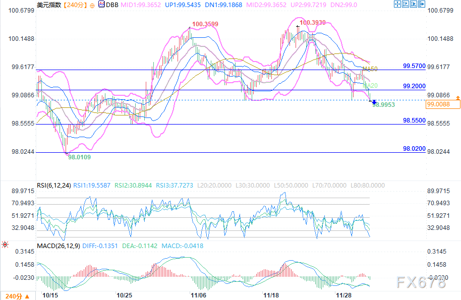 最后关注关键价位:短期支撑集中在当前双下轨附近的98.9989,若跌破则下看前期低点98.5510;阻力方面,第一压力位是双布林带中轨对应的99.2附近(与MA20重叠),其次是前期反弹高点对应的99.5一线,价格反弹至99.2区域时,易受双轨+均线的重叠压制回落。