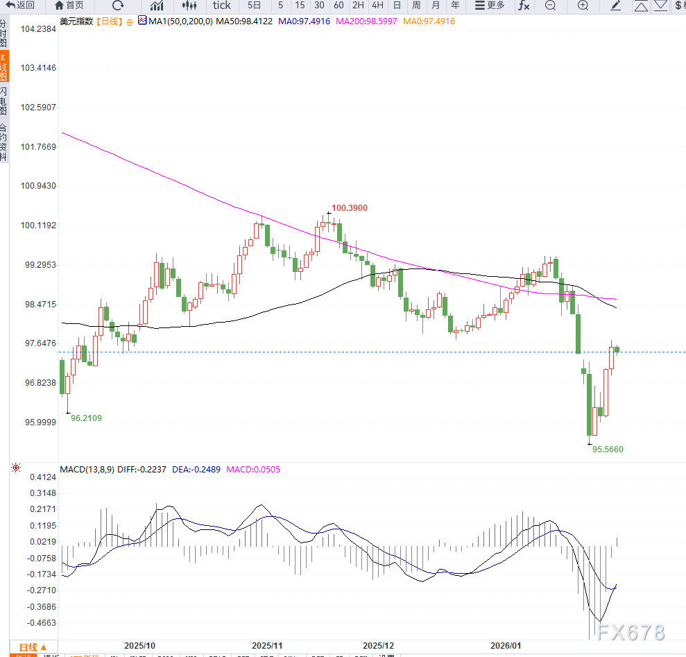 从日线结构观察,美元指数在经历一轮快速反弹后进入整理阶段。此前指数自低位持续回升,动能释放较为集中,目前在97.50附近出现短暂震荡,显示多头动能开始边际放缓。